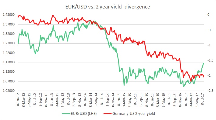 The chart above shows, how the relationship between EUR/USD and 2-year yield divergence has unfolded since 2012. It is evident that these short rates have been a key influencing factor for the pair as policy divergence became evident since 2013.
