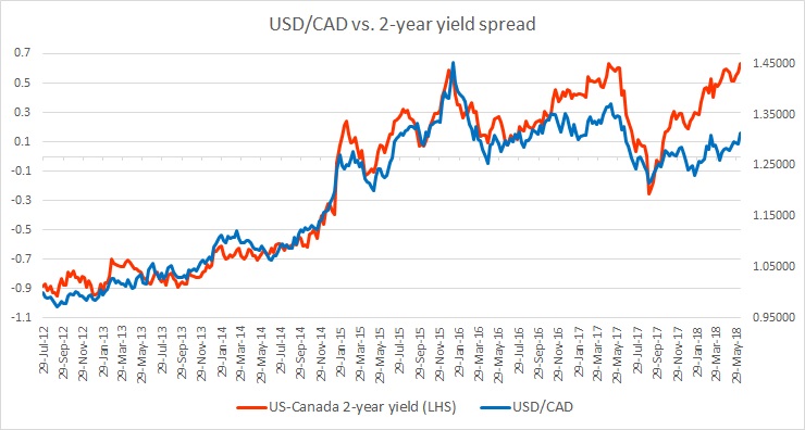 The chart above shows, how the relationship between USD/CAD and 2-year yield divergence has unfolded since 2012.