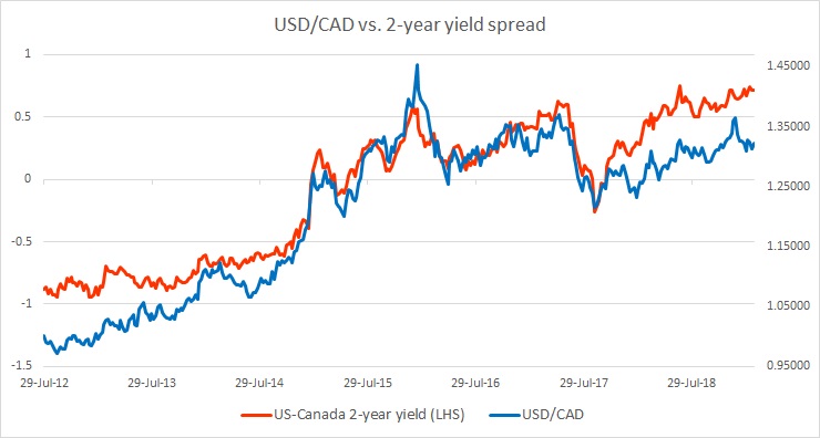 The chart above shows, how the relationship between USD/CAD and 2-year yield divergence has unfolded since 2012.