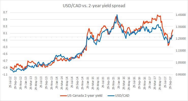- In our early October review, we noted that the spread has moved around 12 basis points in favour of the loonie, and the Canadian dollar strengthened around 80 pips against the dollar.
