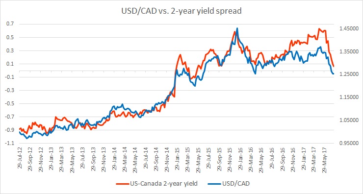 The chart above shows, how the relationship between USD/CAD and 2-year yield divergence has unfolded since 2012.