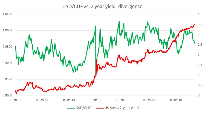 - The divergence continued to widen as spread reached 332 bps while franc is largely unchanged at 0.996 per USD.