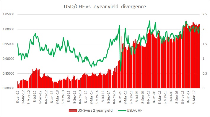 - Just after the Swiss floor shock in January 2015 when the Swiss National Bank (SNB) removed a floor in EUR/CHF at 1.20 this relation went to negative and stayed there until October with an occasional bounce to positive territory. It hasn’t gone much to the negative since.