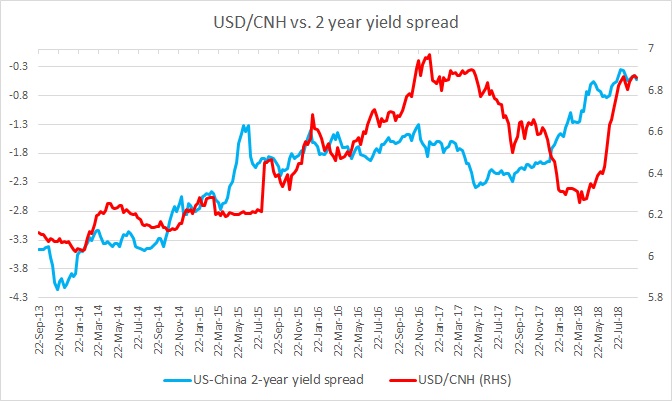 By April, the spread has narrowed from 152 bps to 75 bps as of today in favor of the dollar, whereas the Chinese yuan has strengthened from 6.33 per USD to 6.3 per USD.