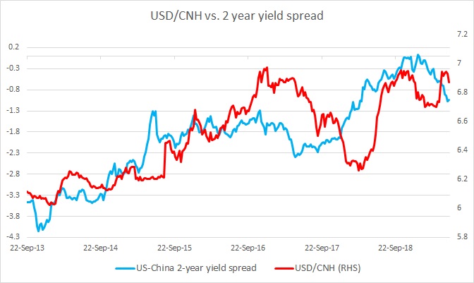 - This chart shows the relation between the U.S. - China 2-year yield spread and the Dollar/Chinese yuan exchange rate since 2013. It is visible even with naked eyes that the two has enjoyed a very close relationship. It can also be seen that the infamous August 2015 devaluation of the Chinese yuan by the People’s Bank of China (PBoC) that led to a global financial turmoil could very well be the result of rising U.S./China 2-year spread.