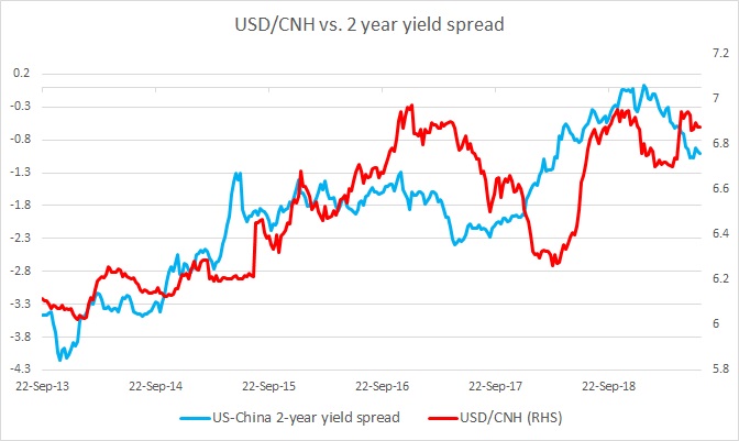 - This chart shows the relation between the U.S. - China 2-year yield spread and the Dollar/Chinese yuan exchange rate since 2013. It is visible even with naked eyes that the two has enjoyed a very close relationship. It can also be seen that the infamous august 2015 devaluation of the Chinese yuan by the People’s Bank of China (PBoC) that led to a global financial turmoil could very well be the result of rising U.S./China 2-year spread.