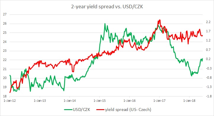 - It can be seen even with a naked eye, that the pair and the yield spread between 2-year treasury and 2-year Czech government bond have enjoyed a fairly close relationship.