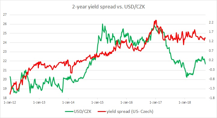 - It can be seen even with a naked eye, that the pair and the yield spread between 2-year treasury and 2-year Czech government bond have enjoyed a fairly close relationship.