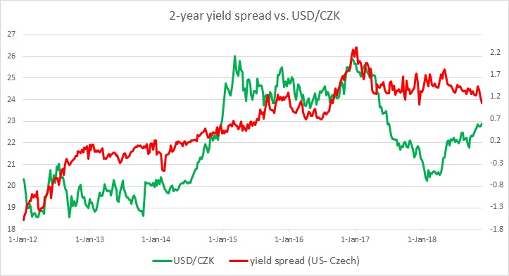 - It can be seen even with a naked eye, that the pair and the yield spread between 2-year treasury and 2-year Czech government bond have enjoyed a fairly close relationship.