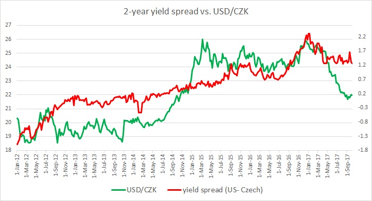 - It can be seen even with a naked eye, that the pair and the yield spread between 2-year treasury and 2-year Czech government bond have enjoyed a fairly close relationship.