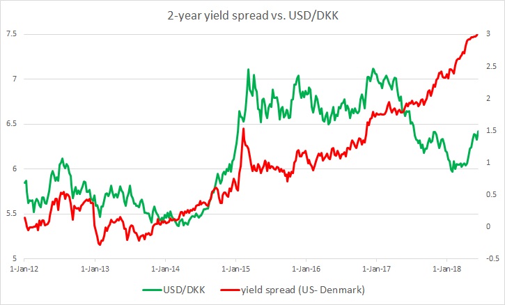 The chart above shows, how the relationship between USD/DKK and 2-year yield spread has unfolded since 2012.