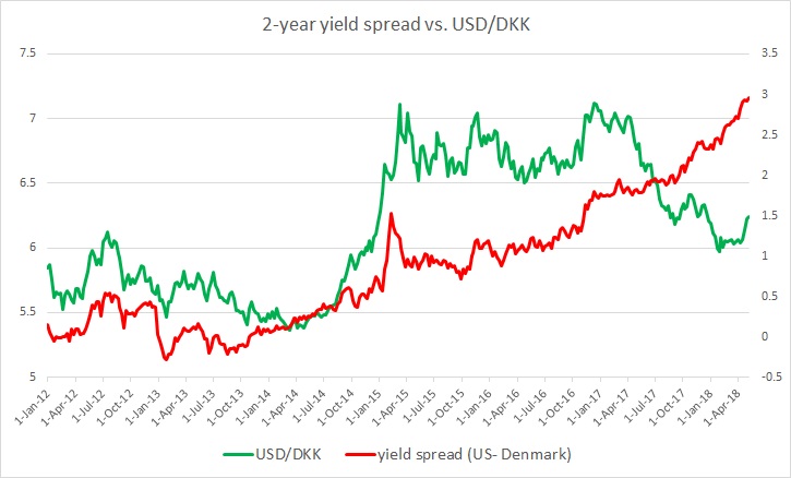 The chart above shows, how the relationship between USD/DKK and 2-year yield spread has unfolded since 2012.