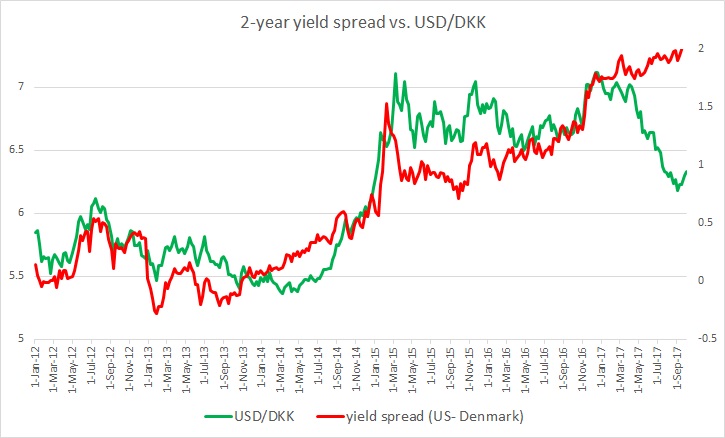 The chart above shows, how the relationship between USD/DKK and 2-year yield spread has unfolded since 2012.