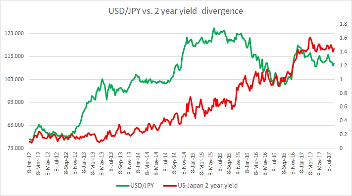 - It had shown excellent response to the yield divergence in the past, especially after Bank of Japan (BoJ) announced its quantitative easing program back in 2012. The close relationship lasted until summer of 2015. US-Japan 2 year yield spread rose from 0.13 percent in 2012 to 0.72 percent by May 2015 and hovered there till October and the exchange rate reached from 76 to 126 in that same period.