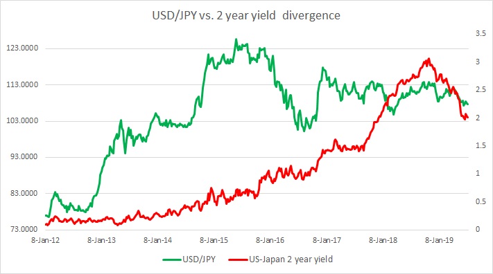 - The yield spread widened from 145 bps in August 2016 to more than 300 bps in December 2018. The USD/JPY, also responding nicely to the widening spread, rose from 109.5 area to 114.