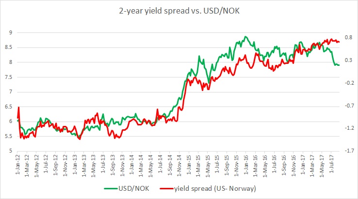 The chart above shows, how the relationship between USD/NOK and 2-year yield spread has unfolded since 2012.
