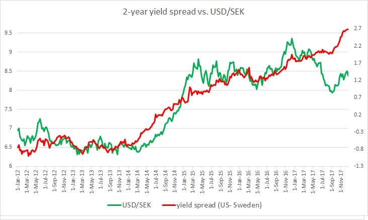 The chart above shows, how the relationship between USD/SEK and 2-year yield spread has unfolded since 2012.