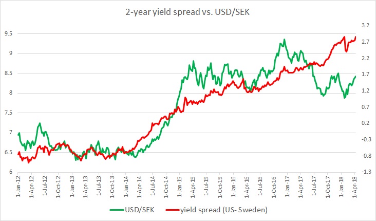 The chart above shows, how the relationship between USD/SEK and 2-year yield spread has unfolded since 2012.