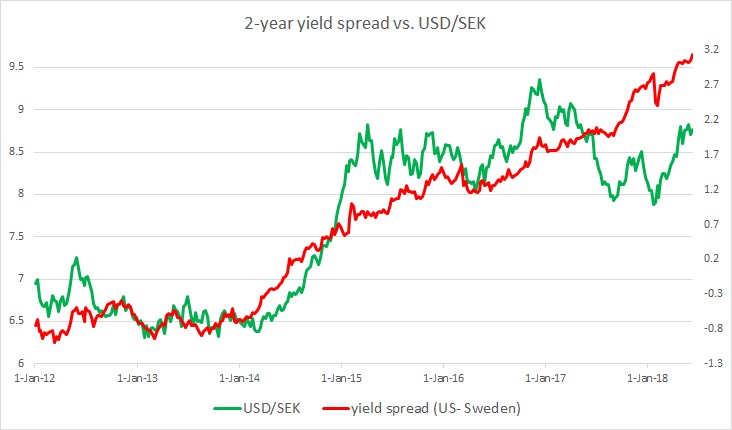 The chart above shows, how the relationship between USD/SEK and 2-year yield spread has unfolded since 2012.