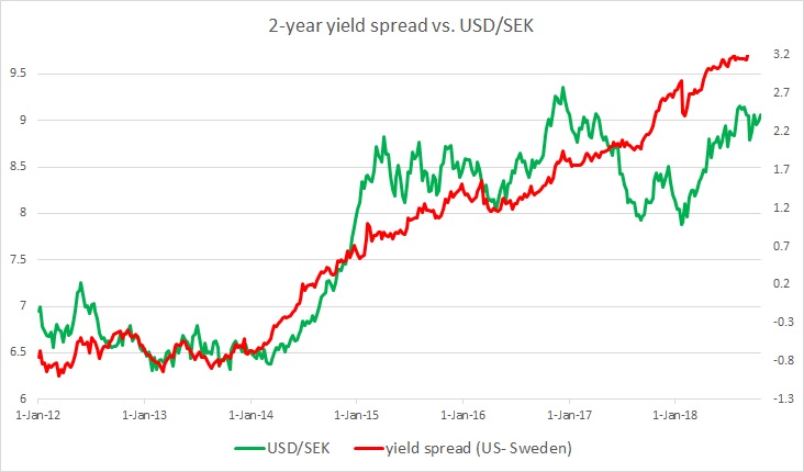 The chart above shows, how the relationship between USD/SEK and 2-year yield spread has unfolded since 2012.