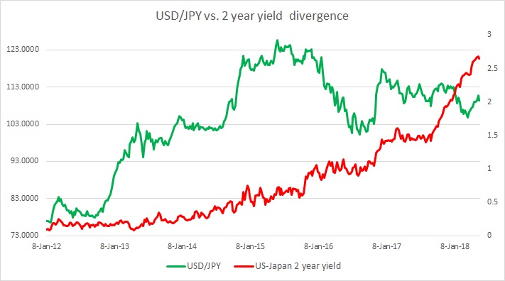- It had shown excellent response to the yield divergence in the past, especially after Bank of Japan (BoJ) announced its quantitative easing program back in 2012. The close relationship lasted until summer of 2015. US-Japan 2 year yield spread rose from 0.13 percent in 2012 to 0.72 percent by May 2015 and hovered there till October and the exchange rate reached from 76 to 126 in that same period.
