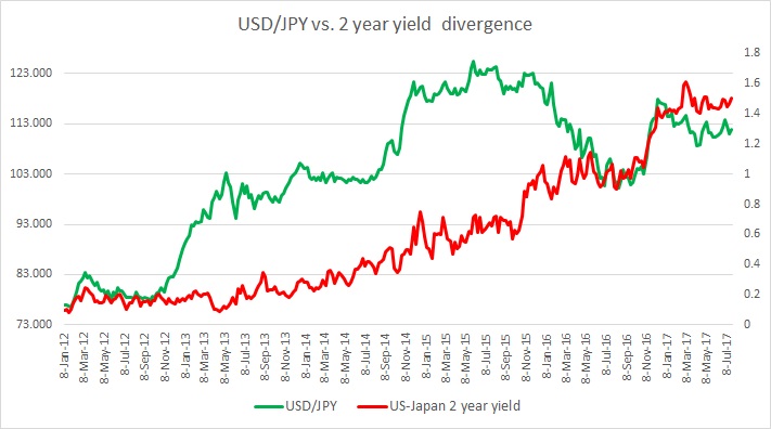 - It had shown excellent response to the yield divergence in the past, especially after Bank of Japan (BoJ) announced its quantitative easing program back in 2012. The close relationship lasted until summer of 2015. US-Japan 2 year yield spread rose from 0.13 percent in 2012 to 0.72 percent by May 2015 and hovered there till October and the exchange rate reached from 76 to 126 in that same period.