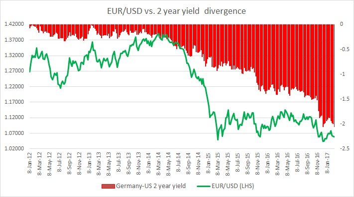 The chart above shows, how the relationship between EUR/USD and 2-year yield divergence has unfolded since 2012. It is evident that these short rates have been a key influencing factor for the pair as policy divergence became evident since 2013.