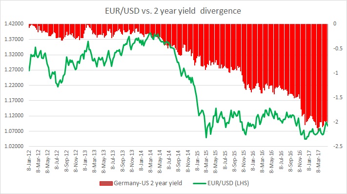 The chart above shows, how the relationship between EUR/USD and 2 year yield divergence has unfolded since 2012. It is evident that these short rates have been a key influencing factor for the pair as policy divergence became evident since 2013.