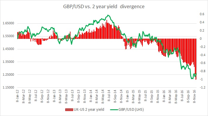 The chart above shows, how the relationship between GBP/USD and 2-year yield divergence has unfolded since 2012.