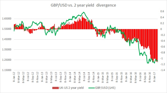 The chart above shows, how the relationship between GBP/USD and 2-year yield divergence has unfolded since 2012.