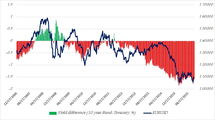 In January 2008, Yield differential between 2 year German bond (German Schatz is used as it is widely accepted Euro zone benchmark risk-free bond) and 2 year US treasury was at 1.13% and Euro was trading at 1.46 against Dollar. That differential as of this week standing at -1.38% and Euro is trading at 1.055 against Dollar.