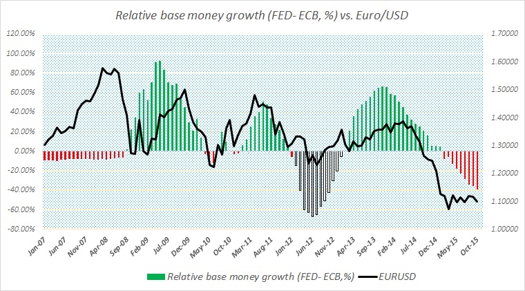 As shown figure, Euro/USD since the crisis is showing high level of correlation with relative monetary policy divergence as measured in rate of changes in base money. While adjusted base money size is much higher than European Central Bank's (ECB), this year pace growth in base money have started to outpace that of FED's.