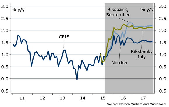"The CPIF path was lowered for the rest of the year and by as much as 0.3% point for the period January-August 2016. CPIF inflation will reach 2% temporarily in early 2016 while it will not establish a level at or above 2% until September next year", foresees Nordea Bank.