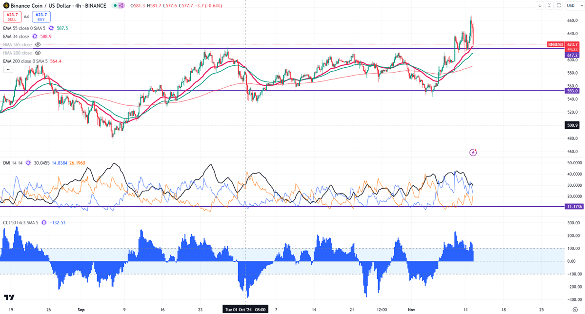 The BNB/USD pair pared some of its gains after hitting a multi-month high of $667 due to profit-booking. It hit a low of $614 at the time of writing and is currently trading around $625. A closing price below $545 confirms further bearishness.