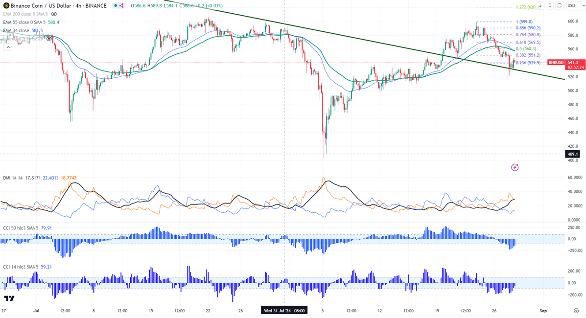 BNBUSD showed a minor pullback from a minor bottom $521.The pair holds well above the short-term (34 and 55 EMA) and long-term moving average in the 4-hour. It hit a high of $546.80 at the time of writing and is currently trading around $543.20.