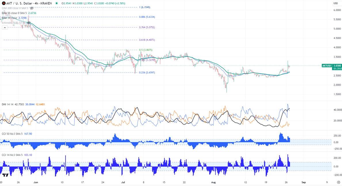 AKTUSD gained more than 35% today after a massive sell-off. The pair holds above the short-term (34 and 55 EMA) and below the long-term moving average in the hourly chart. It hit a high of $2.65 and is currently trading around $2.6648.