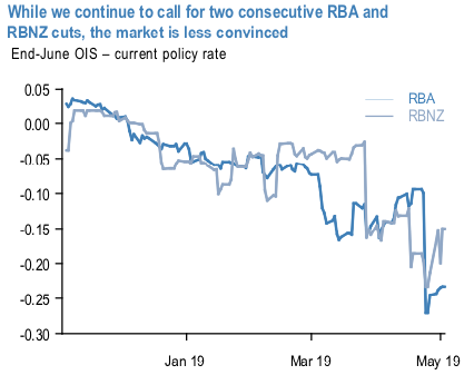 Benchmarking current expectations from the OIS market against our two-cut forecast by June indicates just how much potential downside there is in AUD rates which should lead to a sizable, one-sided widening in USD-AUD rate spreads given the Fed's dismissal of a near-term insurance cut.
