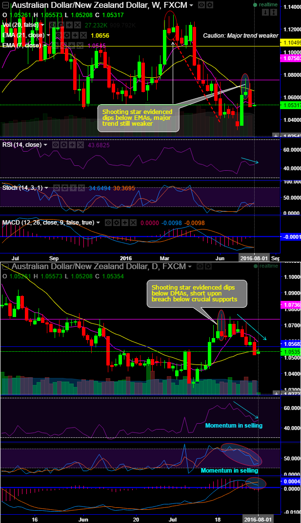 Although Aussie dollar shows strength against Kiwi dollar today it has rejected at resistance levels of 1.0750. Shooting star pattern has occurred at 1.0646 levels on the weekly graph which is bearish in nature.