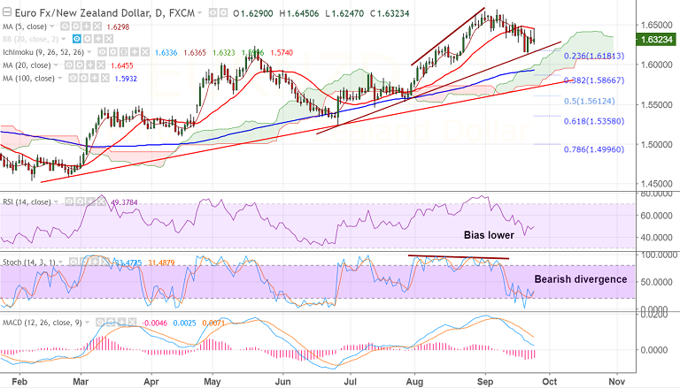 Support levels - 1.6301 (5-DMA), 1.6181 (23.6% Fib retracement of 1.4534 to 1.6690 rise), 1.6165 (trendline), 1.60 (cloud top)