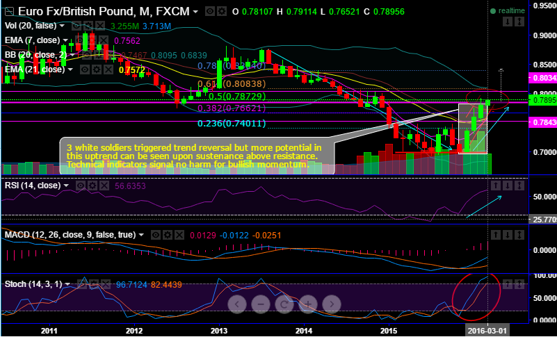 Hence, we would to maintain our long term bullish view on this pair as it has recently broken out crucial resistances at 0.7754 & 0.7843 levels and currently bulls have been able to sustain these levels. Long term investors can go long for targets of 0.80 in next month or so ahead of UK referendum in June for Brexit event.