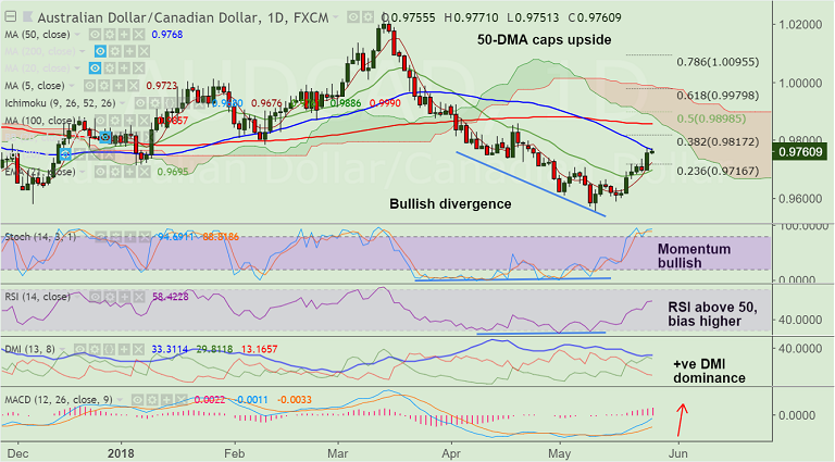 - AUD/CAD is trading in a narrow range on the day, finds stiff resistance at 50-DMA at 0.9768.