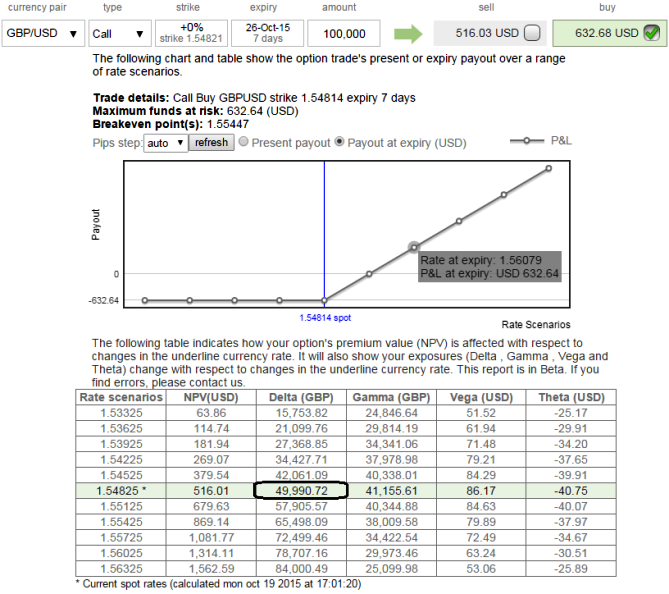 Let us ponder over the delta-hedged at-the-money call option. As shown in the figure, this GBPUSD call option has almost 50% delta (being at-the-money call), so we need to sell half as many lots of the underlying as we own call options in order to delta-hedge.