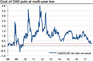 After the Canadian dollar’s sharp rise this year, USDCAD risk reversals have been under heavy pressure, reaching their lowest level since 2009 (refer above chart).