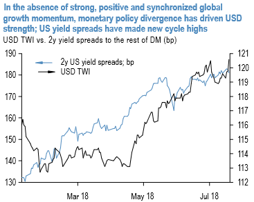 And finally, setting China aside, macro conditions in the US remain firm with our economists now indicating upside risks to their 4%ar 2Q growth forecast. US yields reflect this: 2-year Treasury rates made a new cycle high and US yield spreads to the rest of DM (refer above chart). Indeed, USD strength has coincided with wider yield spreads. Courtesy: JPM