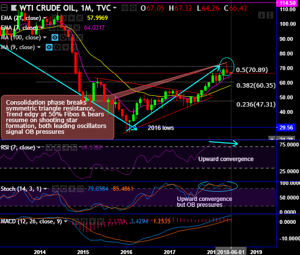 A technical glance at the underlying commodity: WTI crude bulls seem to be exhausted at 50% Fibonacci levels, as a result, shooting star has occurred at 67.03 levels but on the flip side, the consolidation phase appears to be intact on break-out above symmetric triangle (refer monthly chart).
