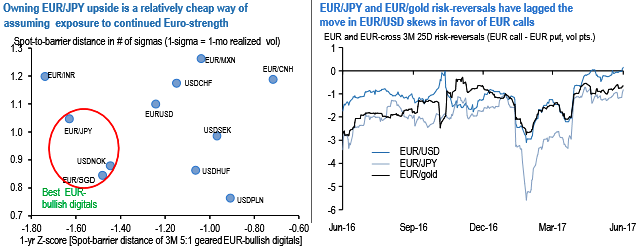 EURUSD risk-reversals flipped positive (bid for EUR calls) this week in sub-3M expiries in response to Euro strength, but there are still two laggards among Euro-crosses that are bid for EUR puts and have room to play catch-up if Euro strength continues: EURJPY (3M 25D r/r -0.8mid) and EUR/gold (3M 25D r/r -0.65 mid). Spot-vol correlation performed strongly positively this week and supports a narrowing of the EUR call discount: a 2.9% rally in EURJPY was accompanied by a 0.85 %pt. jump in 3M ATM, while a2.5% rally in EUR/gold led to a +0.4 vol uptick.