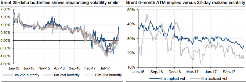 Regardless, sentiment has noticeably turned more constructive on the energy complex in the second half of the year, and in the options market as well. The shape of the volatility smile has seen the impact of relatively higher interest for call options. The bottom-left chart shows contant maturity 25-delta butterflies on short and long-dated Brent options. After bottoming out in July at -1%, these have again turned positive, suggesting the relative volatility premium of OTM put over OTM call options has eased.