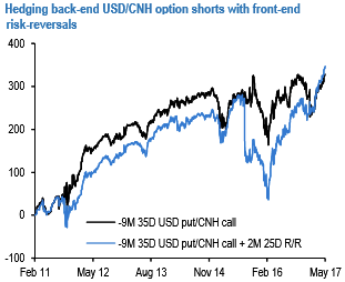 Nonetheless, prudence demands that short FVA or FVA like option constructs require more protection than usual; we suggest buying 2M 25D risk-reversals against selling 9M 35D USD puts/CNH calls(both legs delta-hedged and in equal notionals/leg) that take into account the cheapness of risk-reversals across the curve, especially adjusted for the level of carrying in forwards.