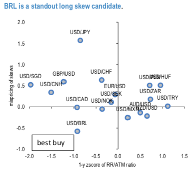 BRL has been one consistent standout currency on the above carry-vol metrics for assessing cheapness of skews. That’s further supported in 1stchart where BRL is the only USD pair that checks all the boxes. Sentiment toward BRL has been largely supportive and our Latam analysts continue to see it as a buy. That is not necessarily negative as grind lower in USDBRL is likely to lead to softer realized vol which would be supportive of the short USDBRL put leg.