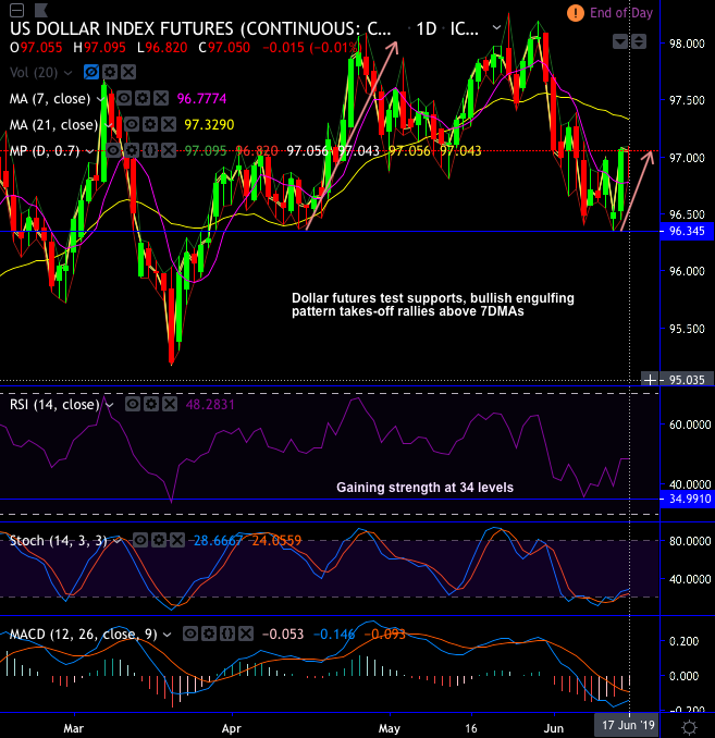 Majority of the dollar pairs are trading little positive momentarily ahead of monetary policy season. Front-end month contracts of US dollar futures are trading at $97.050 levels. But the intermediate trend seems to be quite edgy at 97.995 levels. Technically, we witness constant slumps after shooting star formation at 23.6% Fibonacci levels, on an intermediate trend of dollar weaker and the downtrend appears to be on the cards as the current price slides below EMAs with the intensified momentum (refer weekly plotting).